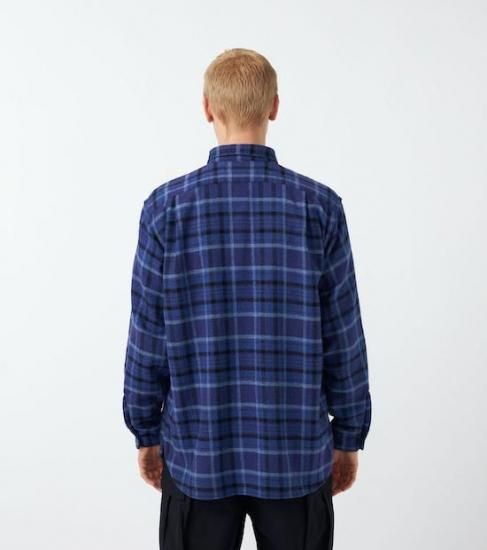 コットンとリサイクルポリエステルの混紡糸を使用したフランネルチェック生地を使用したレギュラーカラーシャツ。
