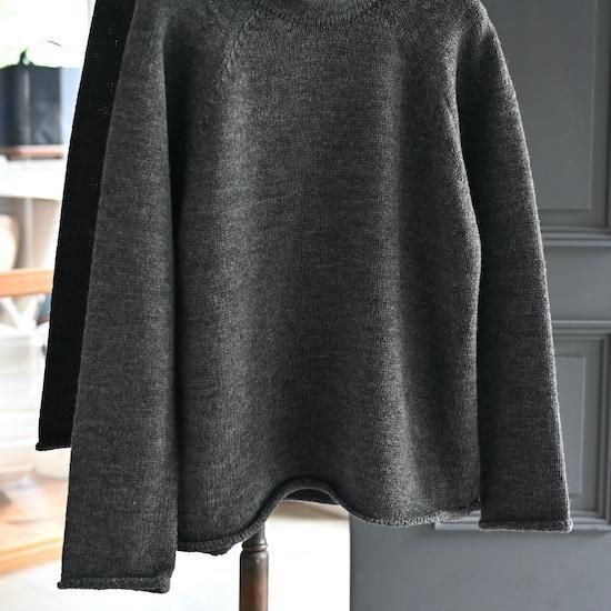 首元、裾、袖口はリブを施さず、断ち切り処理したようなロール始末。首回りも締めつけ感が無く、程良くゆとり有るのでシャツと合わせても襟元の収まりが良いです。