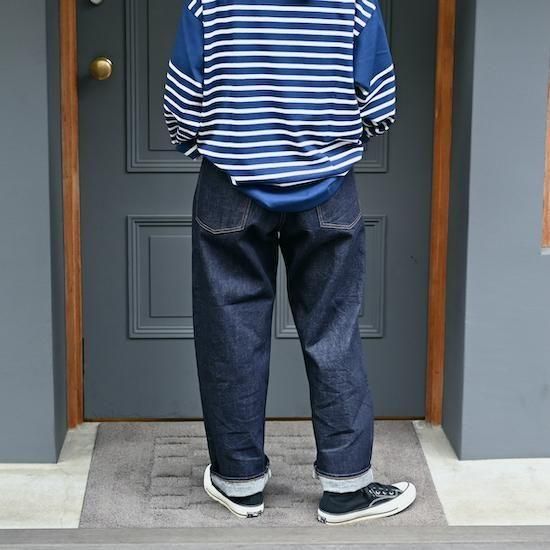 やや下がって付いている大きめのバックポケット、やや股上深くワタリ幅と膝幅が太いバギーシルエットが特徴です。