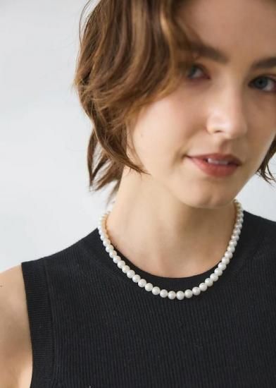7.5ミリから8ミリの、カジュアルに使いやすいバランスのパール粒を選んで制作しており、カジュアルなスエットにもバッチリ合う長さで作っています。